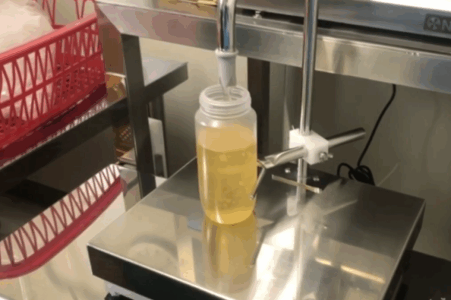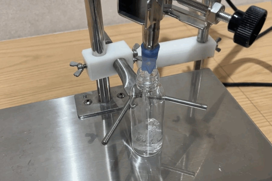 泡立ちを防ぎながら充填したい場合は、オプション品の昇降ノズル装置(SNS)と組み合わせて充填機を使用することをおすすめしています。充填開始と同時にノズルが自動で上下し、ボトルの底から液体を注入することで、泡の発生を最小限に抑えます。