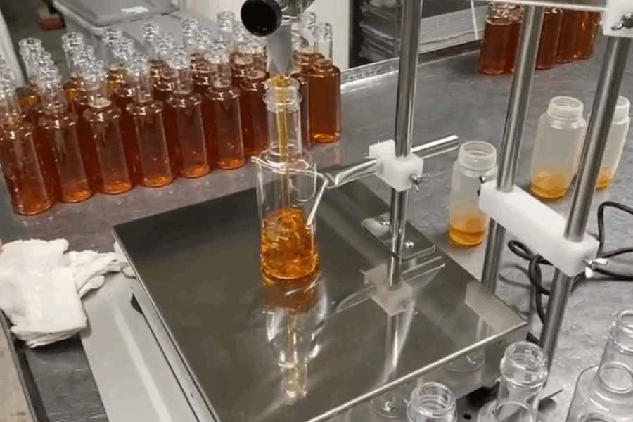 粘度のある液体でも安定した注入ができるチューブ充填機またはロータリー式充填機を使用します。計量ユニットにより、設定した容量を正確にボトルに充填できるため、製品ごとのばらつきを抑え、一定品質での充填作業が可能です。